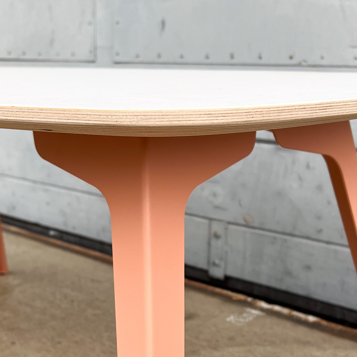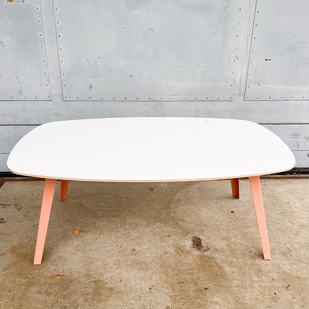Dit is onze eerste salontafel, gemaakt van gerecycled witte denim. De tafel is vormgegeven in dezelfde stijl als onze tafels, met de kenmerkende Deens ovale vorm. Voor het onderstel kozen we de kleur beigerood (RAL3012), de meest populaire keuze van de afgelopen jaren. Een leuk detail: aan de onderkant van de tafel is in de poot het Fabricado-logo verwerkt.