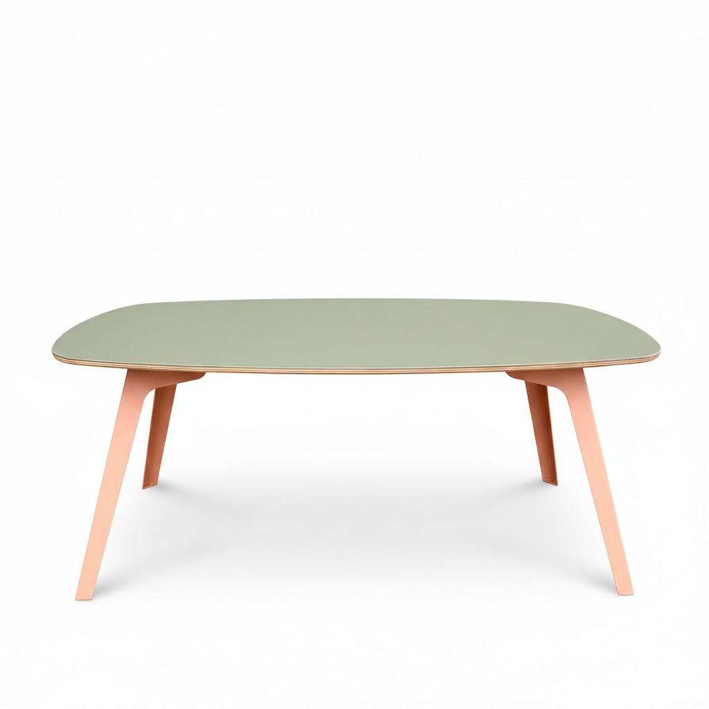 De salontafel is vormgegeven in dezelfde stijl als onze tafels, met de kenmerkende Deens ovale vorm. Voor het onderstel kozen we de kleur beigerood (RAL3012), de meest populaire keuze van de afgelopen jaren. Een leuk detail: aan de onderkant van de tafel is in de poot het Fabricado-logo verwerkt.