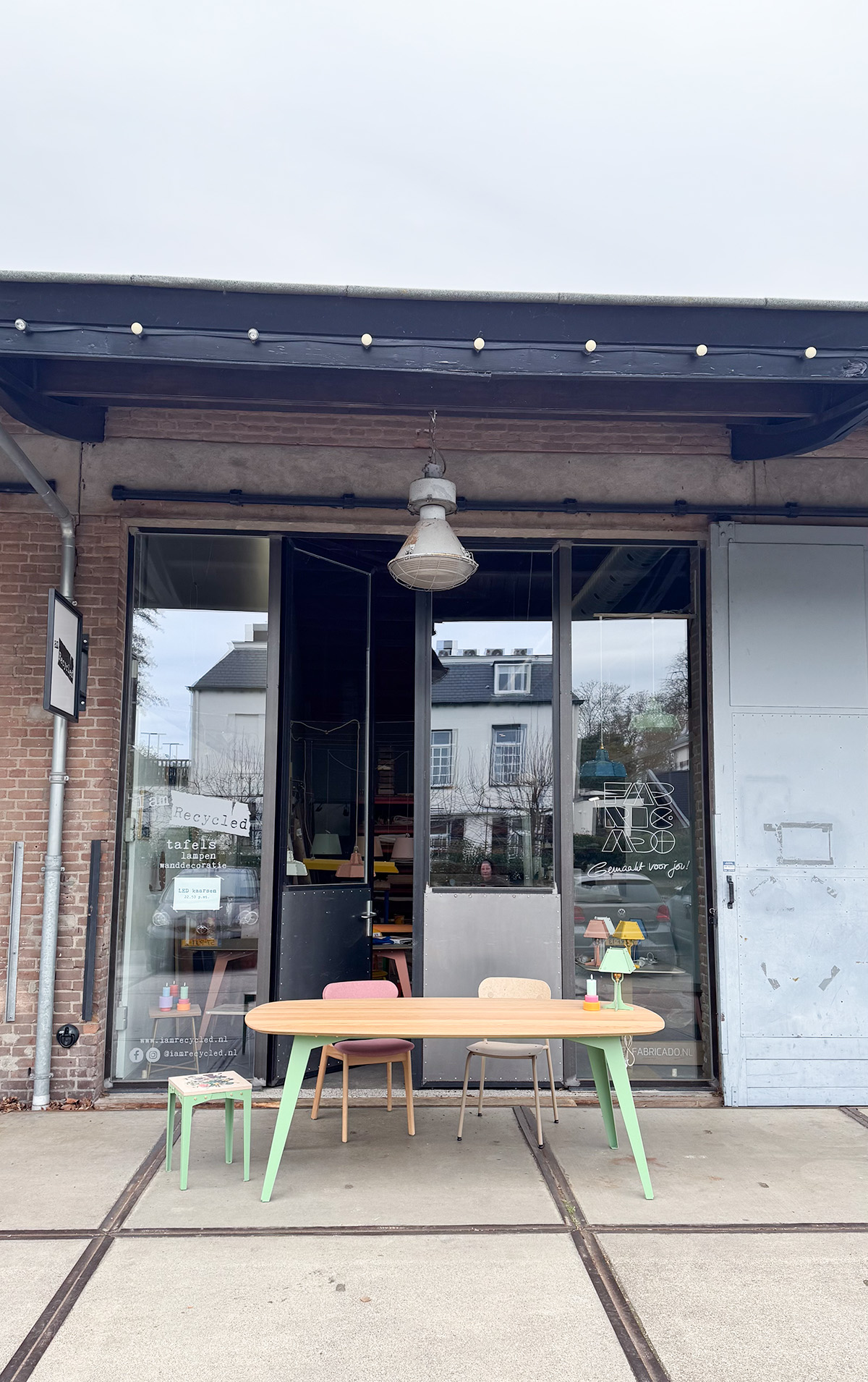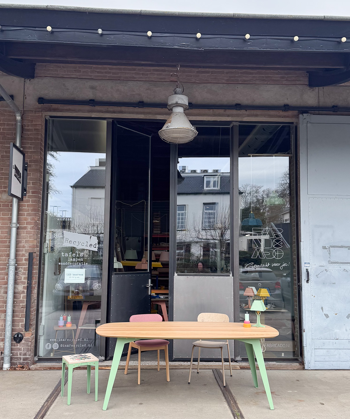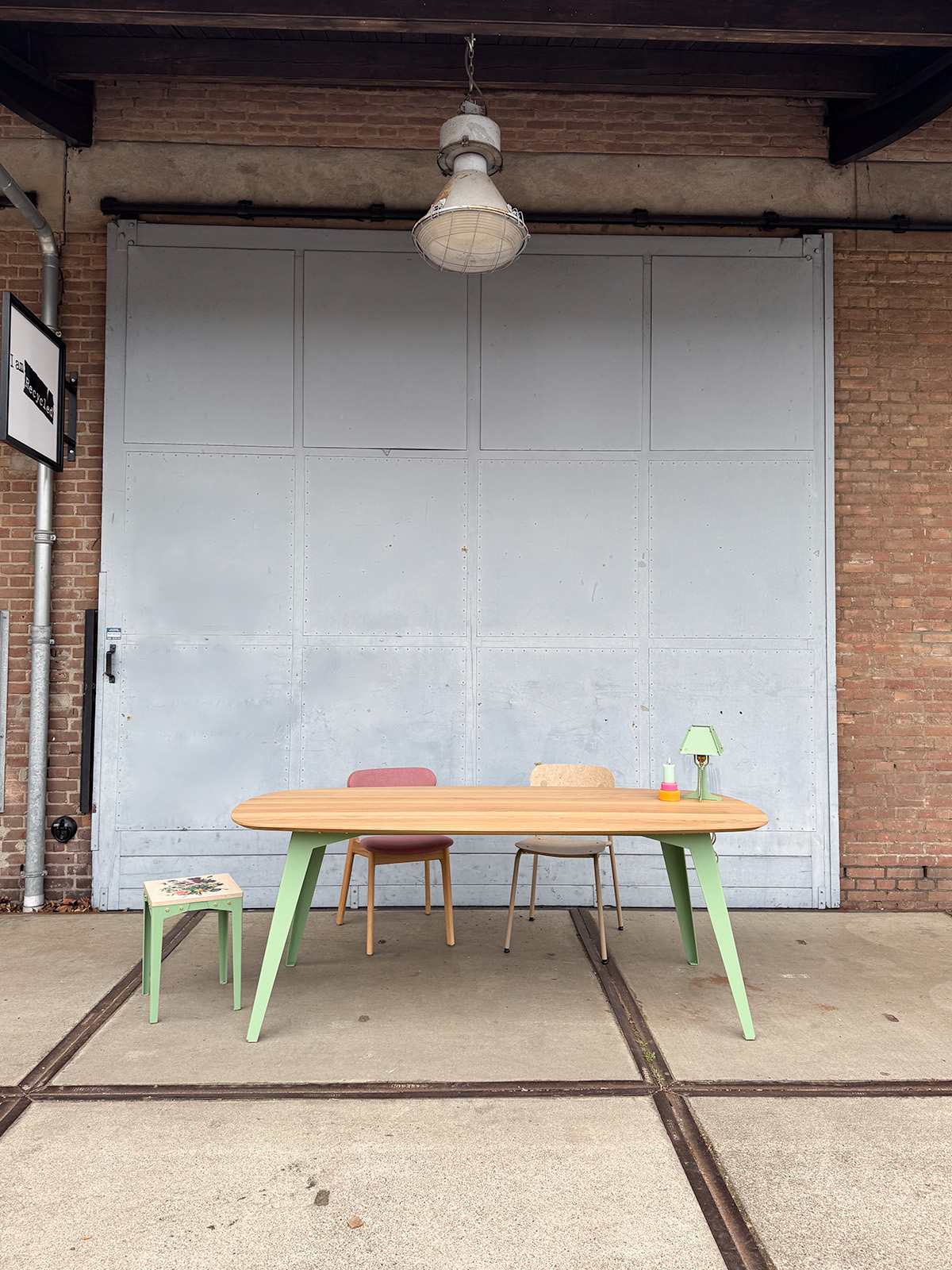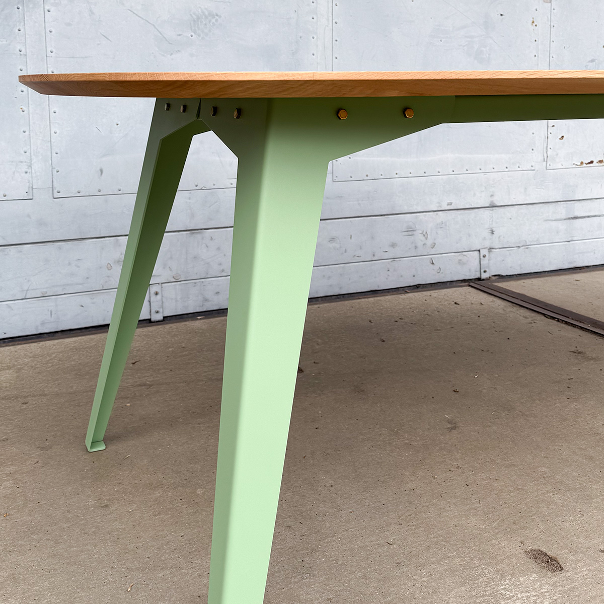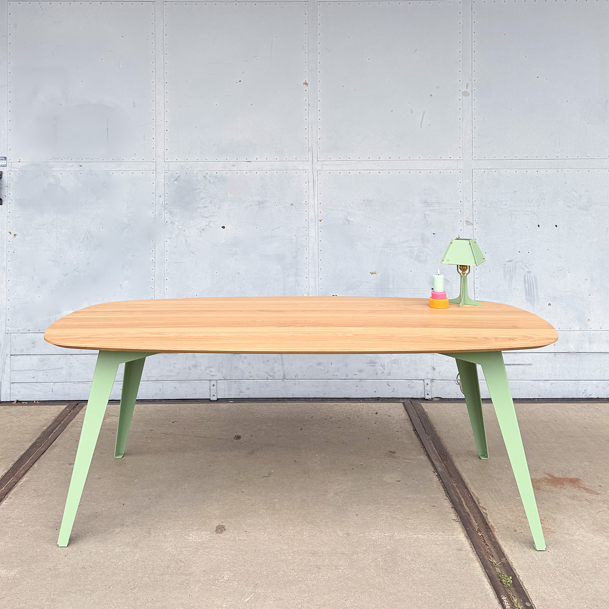 Dit tafelblad is op dit moment alleen mogelijk met ons schuine onderstel. Je kan de kleur zelf kiezen. Veel van deze kleuren vormen een schitterend contrast of juist een rustige match met het eiken. Kleur onderstel van de foto is Ral 6021 (bleekgroen)